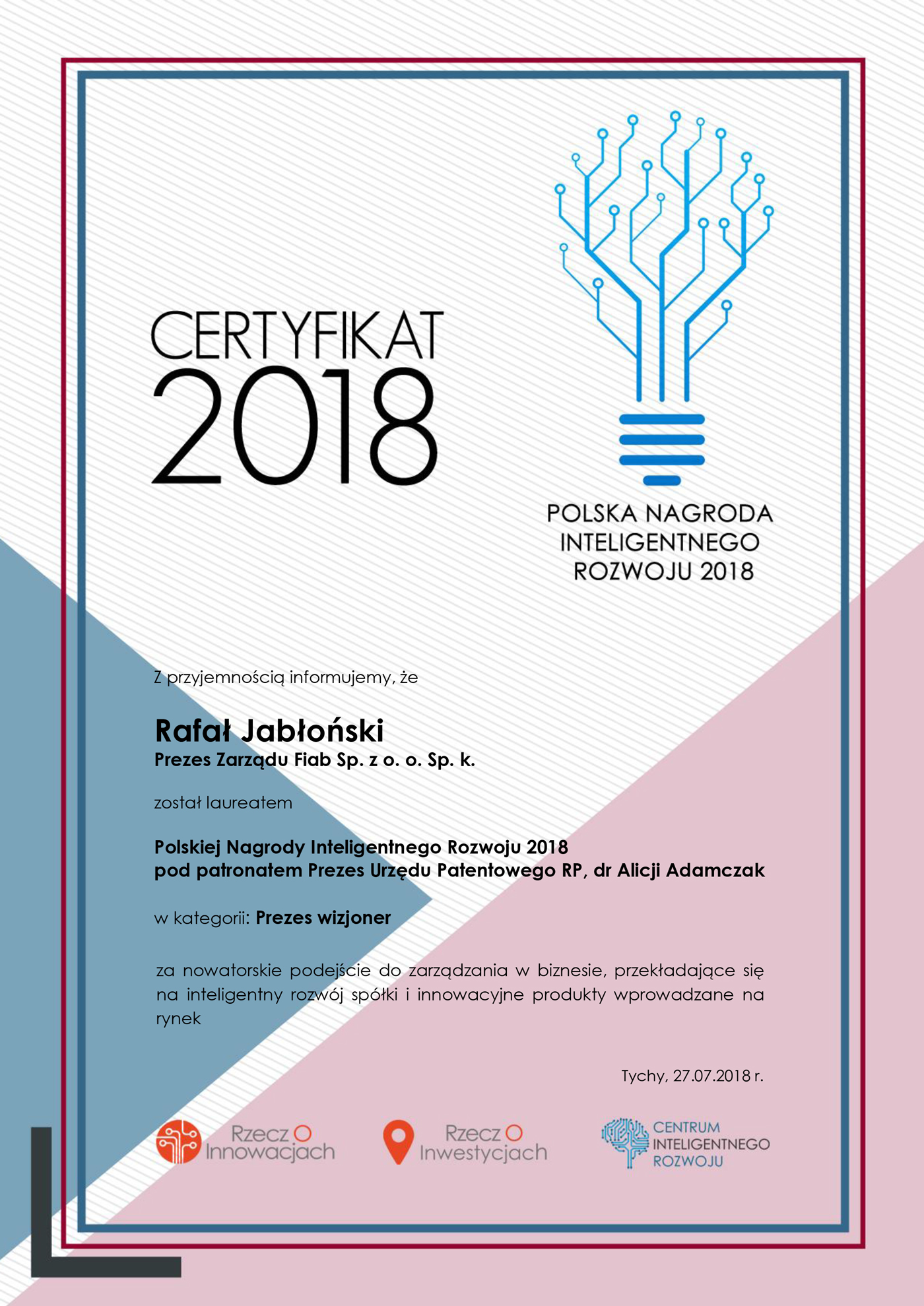 Rok 2018 okazał się dla nas niezwykle owocny, spółka FIAB po raz trzeci została laureatem Polskiej Nagrody Inteligentnego Rozwoju 2018 przyznawanej pod patronatem Prezesa Urzędu Patentowego RP. Dodatkowo, za nowatorskie podejście do zarządzania w biznesie, przekładające się na inteligentny rozwój spółki i innowacyjne produkty wprowadzane na rynek, Centrum Inteligentnego Rozwoju zdecydowało się przyznać Prezesowi Rafałowi Jabłońskiemu Polską Nagrodę Inteligentnego Rozwoju w kategorii: Prezes wizjoner.