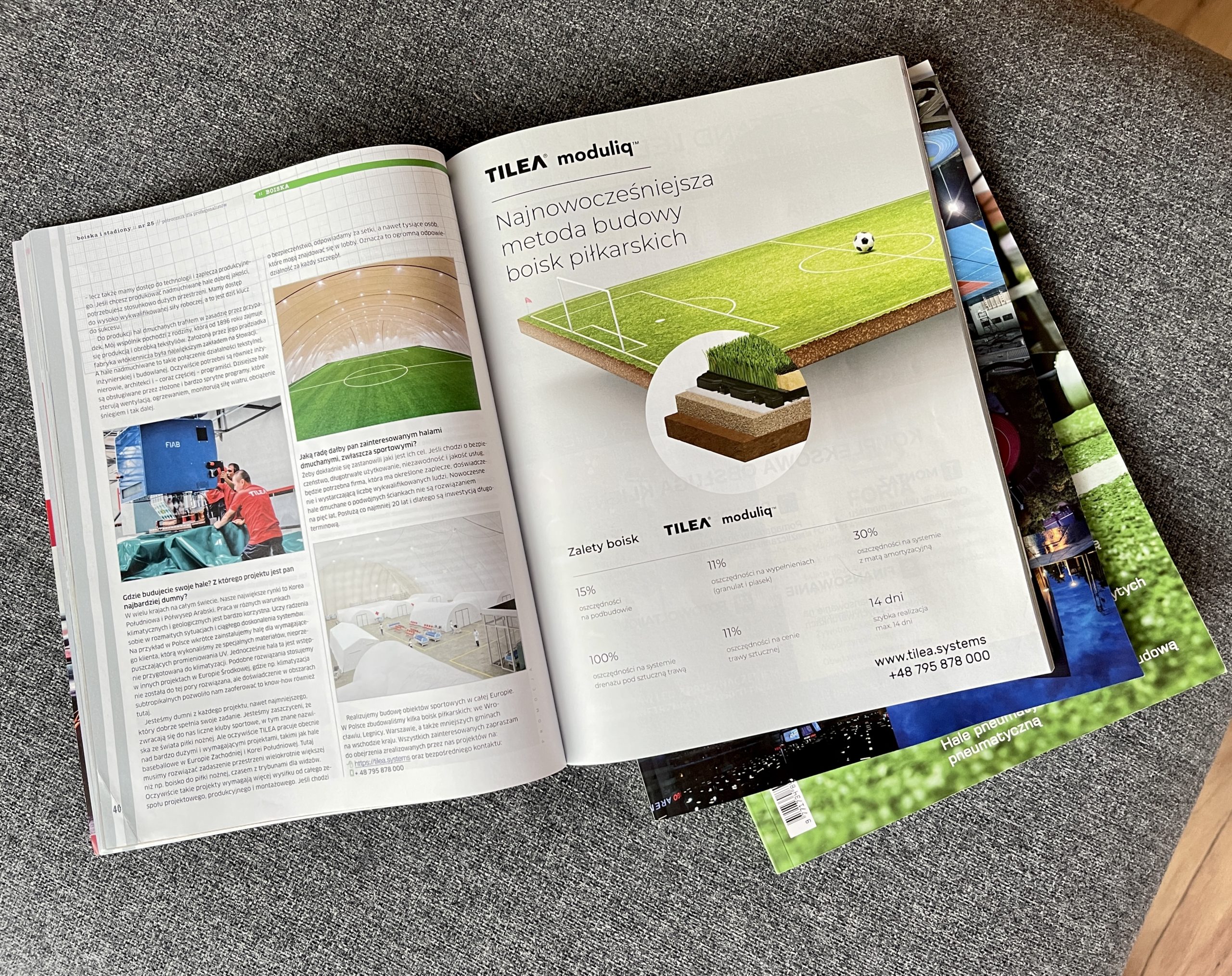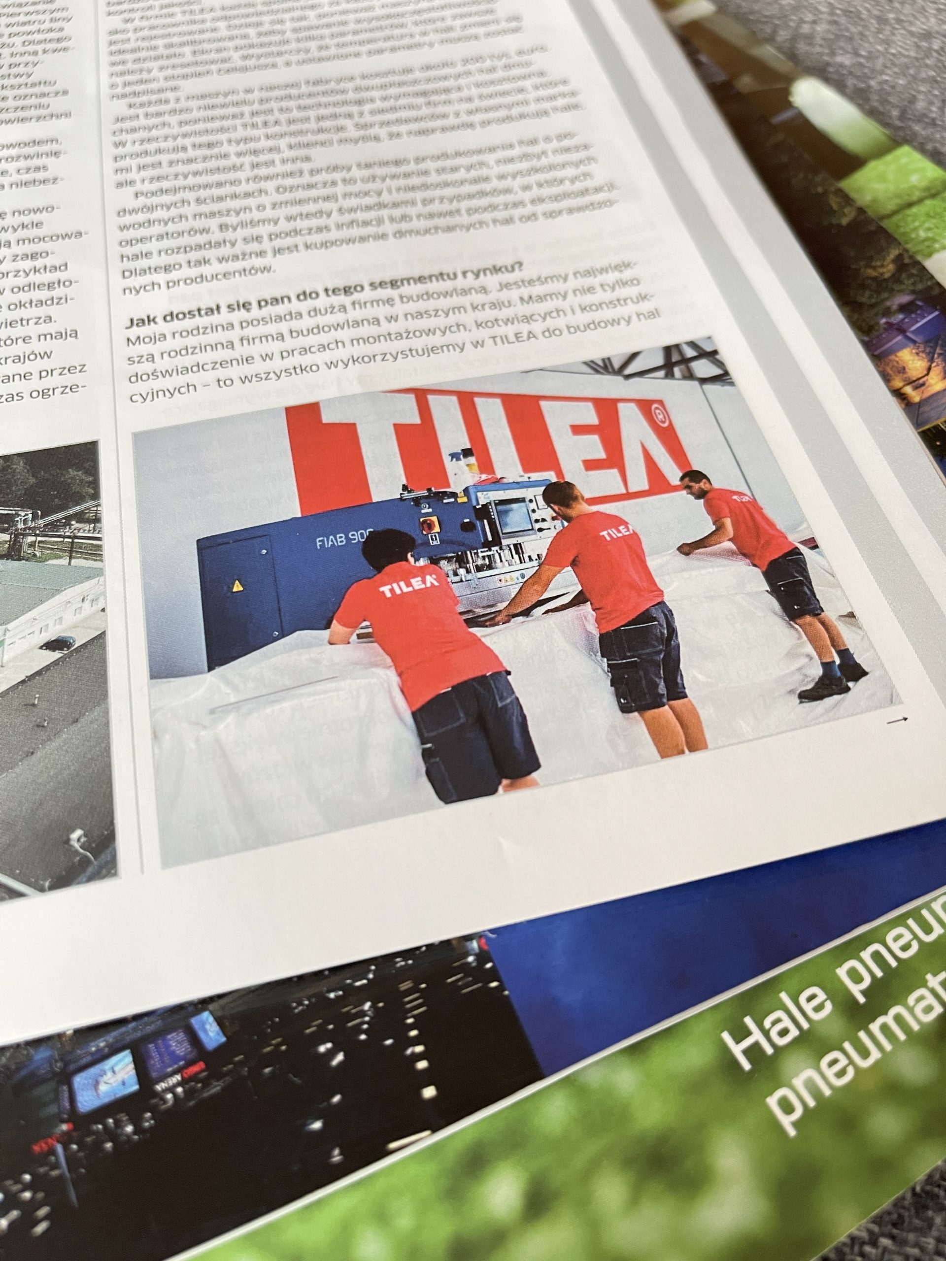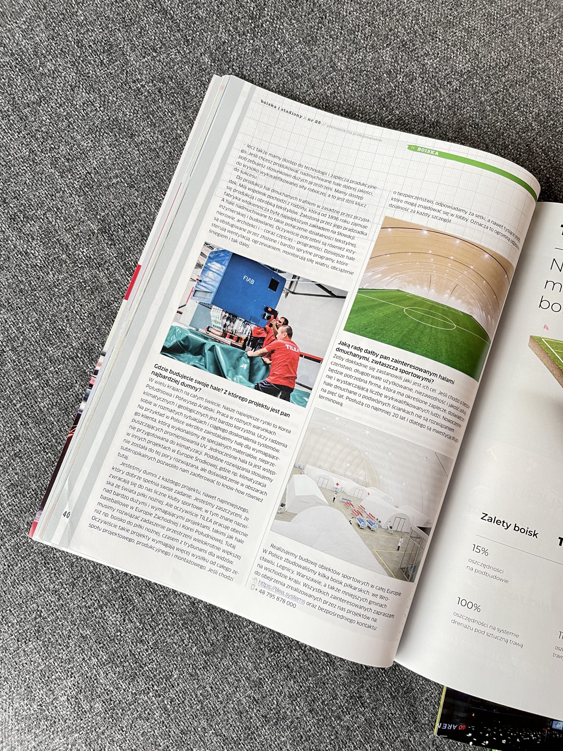 Niedawno w czasopiśmie „Boiska i stadiony” ukazał się artykuł o jednym z naszych klientów - Tilea. Słowackiej firmie, która zajmuje się profesjonalną produkcją hal pneumatycznych i boisk piłkarskich.