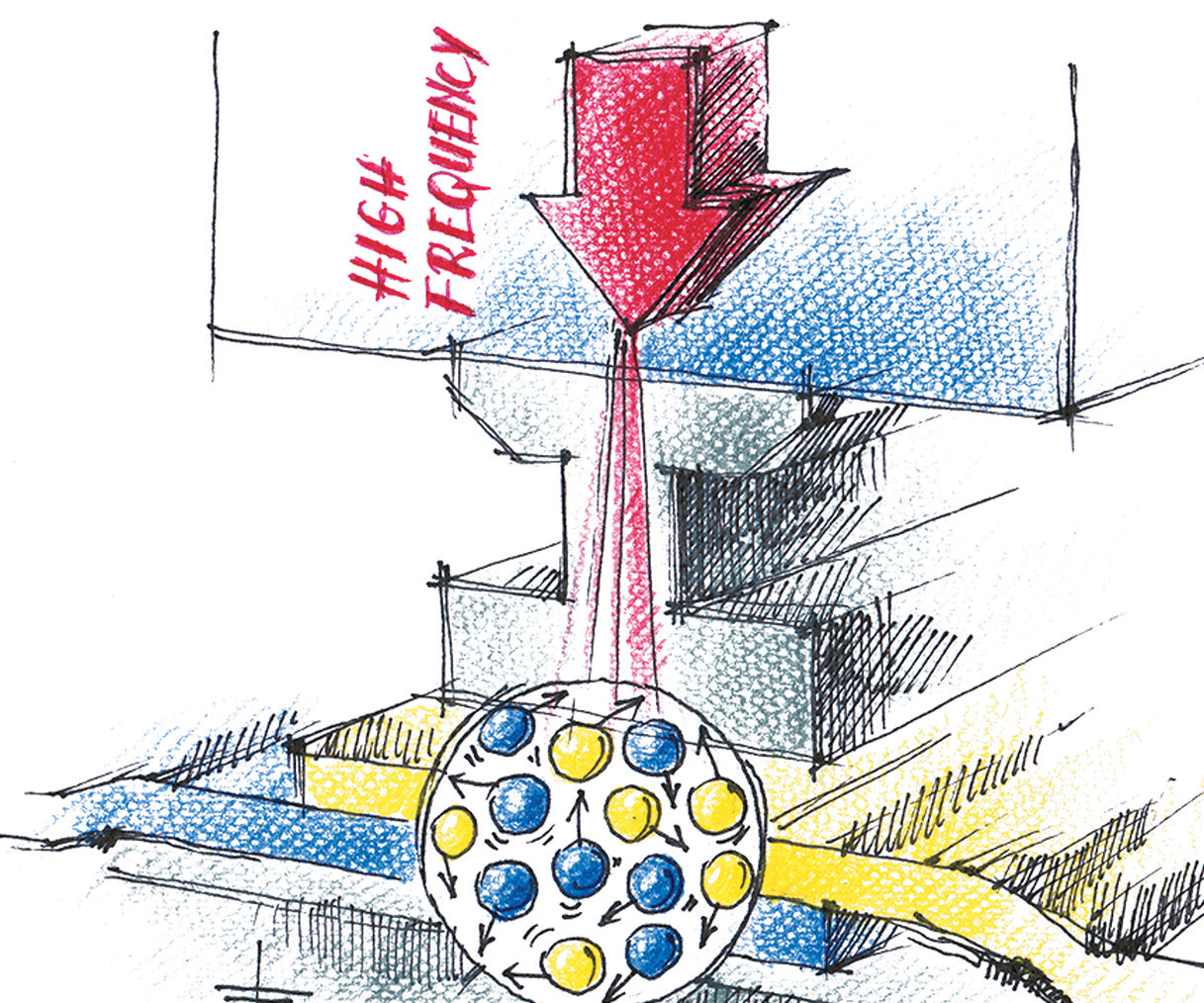 • Następuje dynamiczny wzrost temperatury wewnątrz materiału, w wyniku drgań cząsteczek, które ocierając się wzajemnie generują ciepło