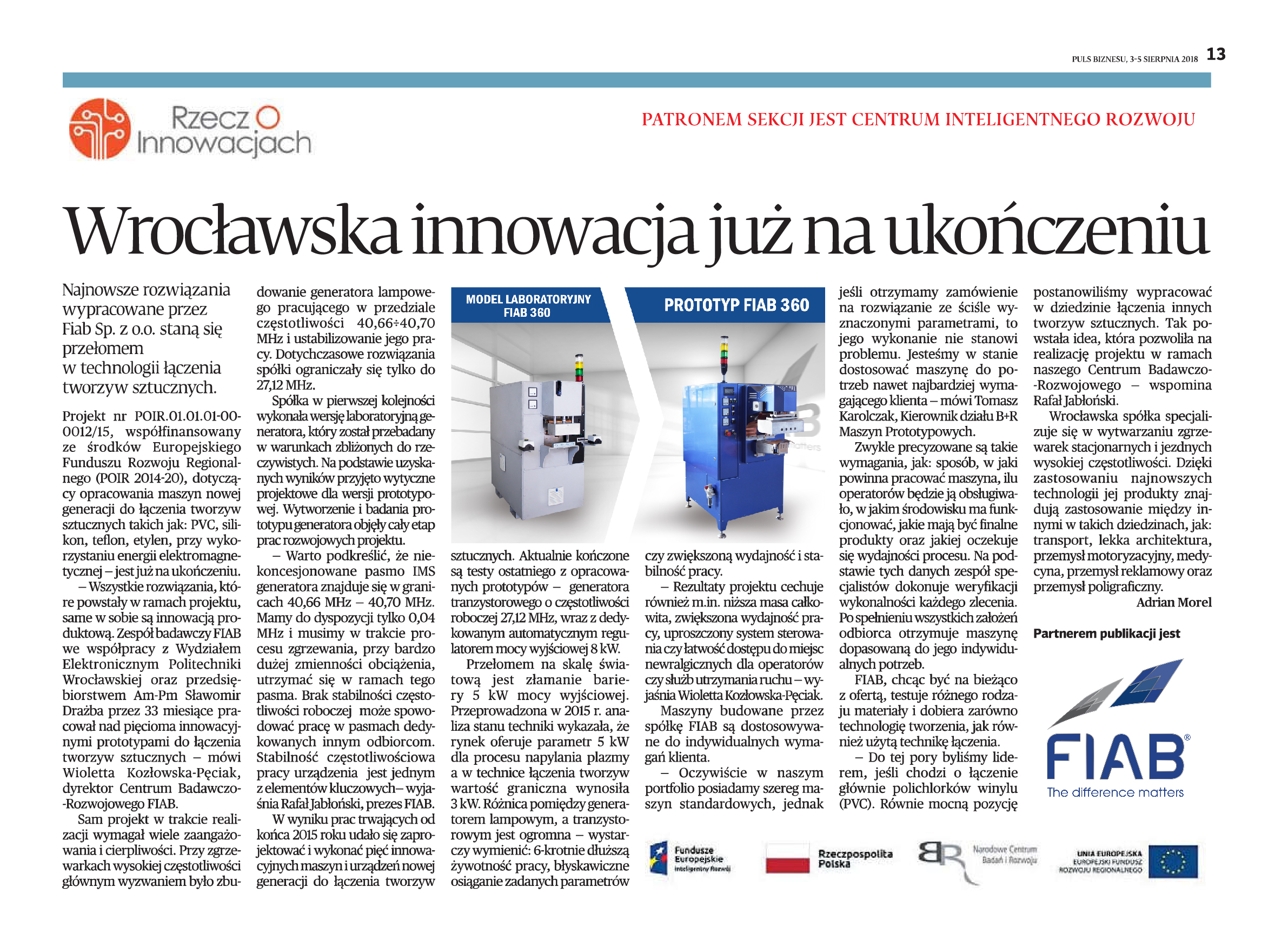 W najnowszym wydaniu Pulsu Biznesu, które ukazało się 03.08.2018 pojawił się artykuł podsumowujący osiągnięcia projektu, który jest już na ukończeniu - projektu współfinansowanego ze środków Europejskiego Funduszu Rozwoju Regionalnego (POIR 2014-20), dotyczącego opracowania maszyn nowej generacji do łączenia tworzyw sztucznych takich jak: PVC, silikon, teflon, etylen, przy wykorzystaniu energii elektromagnetycznej.